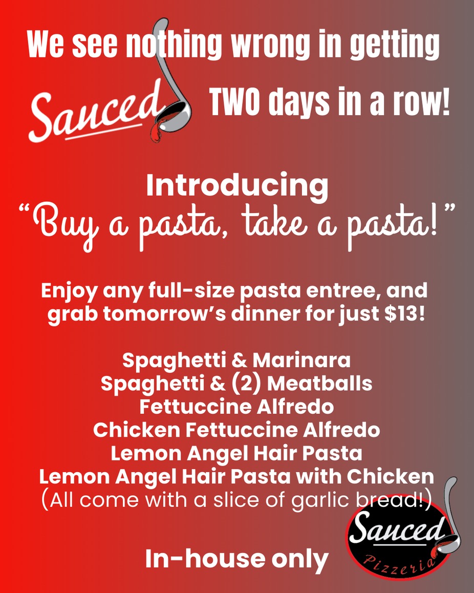 "That's too much pasta!", said NO ONE EVER. Weekdays are busy and diets are overrated. Dine in for this screamin' deal!
